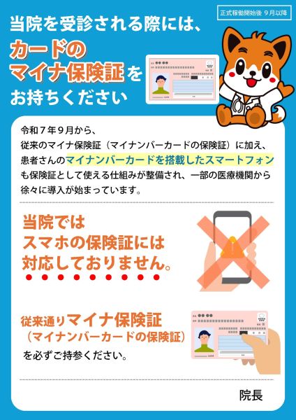 スマホの保険証対応について 2025.09.19 当院では、スマートフォンにマイナ保険証の情報を搭載し利用する機能「スマホ保険証」はご利用になれません。 令和7年9月19日(金)から全国的に導入予定ですが、現時点での当院の対応開始日は未定です。 受診の際は、保険証、マイナンバーカードまたは資格確認書をお持ちくださいますようお願いいたします。